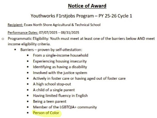 Massachusetts regulations now require lottery-based admissions for oversubscribed vocational programs for students entering Fall 2026. This complaint concerns ENSATS’ admissions-policy revisions and implementation (including any pre-lottery criteria) and an alleged race-based eligibility criterion in a limited-slot opportunity.